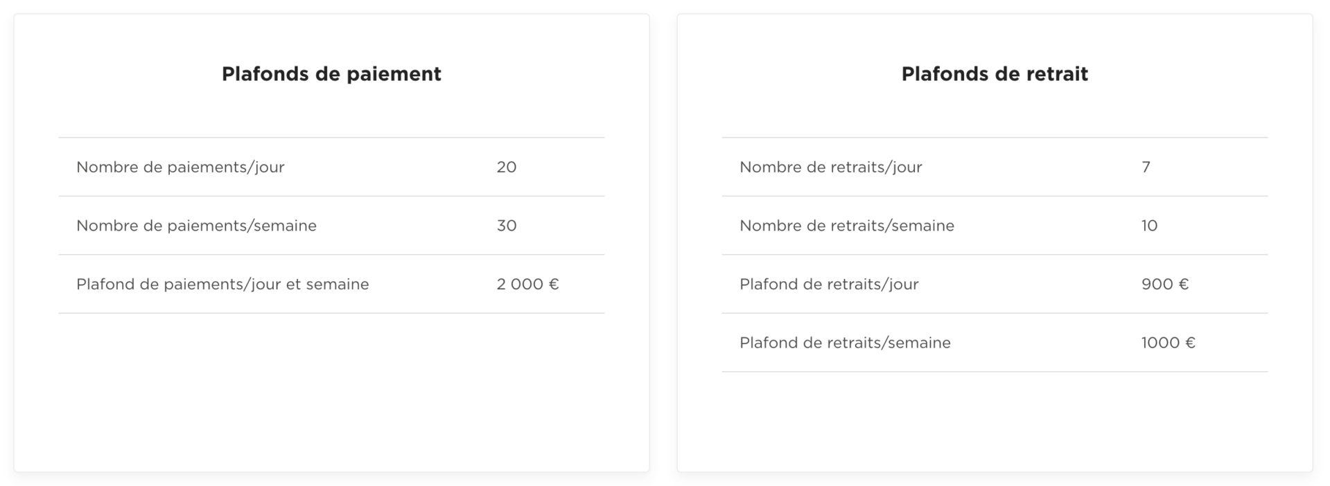 Le plafond de paiement est de 30 paiements pour un total de 2.000€ sur 7 jours.
