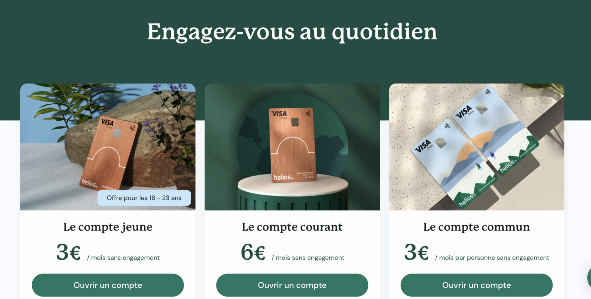 Helios propose également des comptes Helios banque durables pour les 18-23 ans à moitié prix, soit 3 € par mois pendant un an. Le compte comprend :